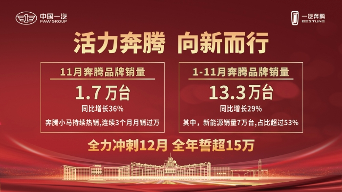 本网讯 11月,奔腾品牌整车销售1.7万辆,同比增长36%。1-11月,奔腾品牌整车销售13.3万辆,同比增长29%。其中,新能源销售7万辆,占比53%;奔腾小马持续热销,连续3个月月销过万。