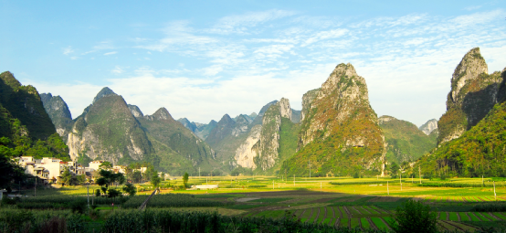 从高处俯瞰喀斯特岩溶峰丛地貌,千峰万仞排山倒海,气势恢宏,广西壮族自治区凤山县正坐落在这秀丽的山间。