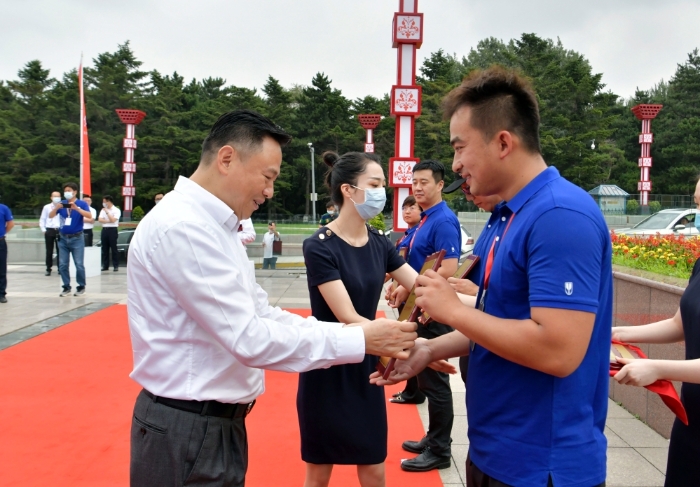 在一号门广场前,集团公司董事长、党委书记徐留平为七位红旗经典车车主颁发“红旗文化大使”荣誉称号证书,并合影留念。集团公司党委常委、副总经理雷平主持仪式。