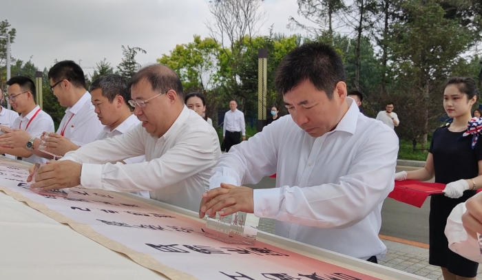 刘亦功与红旗经典车车主共同在《新红旗赋》长卷上盖印留念