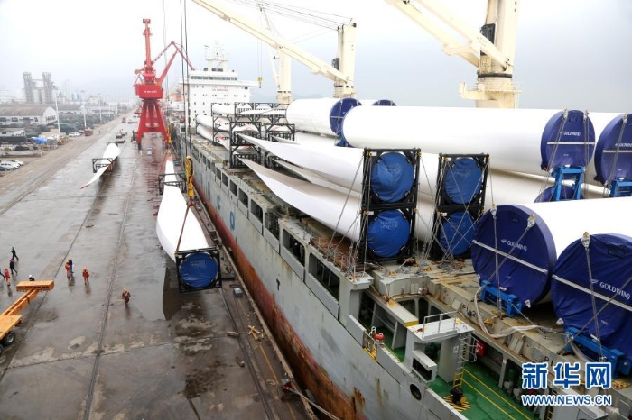 2月28日,一艘货轮在江苏连云港港东方公司码头装载风力发电设备。新华社发(王春 摄)