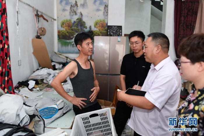 在浙江省衢州市衢江区杜泽镇老街,服装来料加工小微企业主周建斌(左一)向信贷人员介绍经营情况(2020年9月10日摄)。浙江省担保集团有限公司推出多项服务,帮助解决小微企业和“三农”融资难融资贵问题。新华社记者 黄宗治 摄