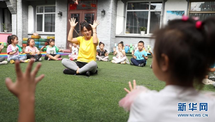 幼教老师在辽宁省凤城市大梨树村萌芽幼儿园里带领孩子们游戏(2020年9月9日摄)。新华社记者 姚剑锋 摄