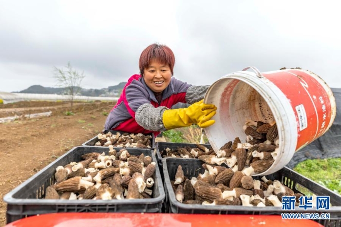 2月27日,村民在贵州省毕节市黔西县甘棠镇大寨村羊肚菌种植基地装运羊肚菌。为巩固脱贫成效,甘棠镇采取“社社联建”的发展模式发展羊肚菌种植,既解决群众就近务工,又带动农户增收。新华社发(范晖 摄)