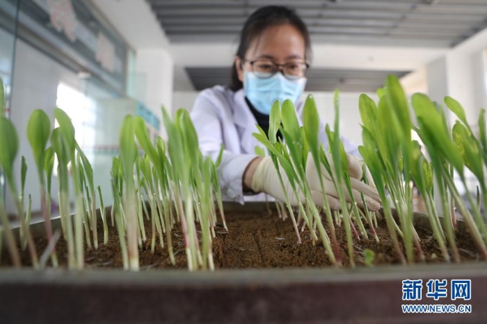 在辽宁东亚种业有限公司种子质量检测中心,工作人员查看玉米种子发芽实验结果(2020年3月16日摄)。新华社记者 杨青 摄