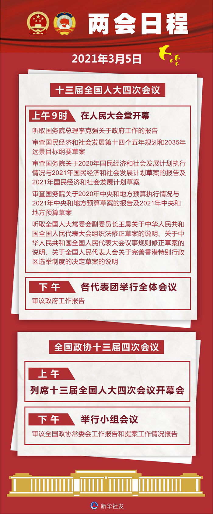 十三届全国人大四次会议5日上午9时在人民大会堂开幕,听取国务院总理李克强关于政府工作的报告,审查国民经济和社会发展第十四个五年规划和2035年远景目标纲要草案,审查国务院关于2020年国民经济和社会发展计划执行情况与2021年国民经济和社会发展计划草案的报告及2021年国民经济和社会发展计划草案,审查国务院关于2020年中央和地方预算执行情况与2021年中央和地方预算草案的报告及2021年中央和地方预算草案,听取全国人大常委会副委员长王晨关于中华人民共和国全国人民代表大会组织法修正草案的说明、关于中华人民共和国全国人民代表大会议事规则修正草案的说明、关于全国人民代表大会关于完善香港特别行政区选举制度的决定草案的说明。下午,各代表团举行全体会议,审议政府工作报告。