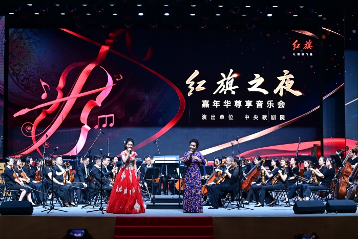 一曲《红旗颂》拉开了红旗之夜嘉年华尊享音乐会的大幕,观众们仿佛回到了那段激情燃烧的岁月。歌剧《红梅赞》选段、歌曲《红旗飘飘》、小提琴演奏《梁山伯与祝英台》、歌曲《让世界充满爱》……整场音乐会通过中外经典歌剧选段、励志曲目演绎、西式乐器演奏、经典合唱等,再现峥嵘岁月的历史回响,用时代交织的歌声,唱响“让理想飞扬”的美妙篇章,用东西方交融的协奏曲,彰显新高尚精致主义的情怀。