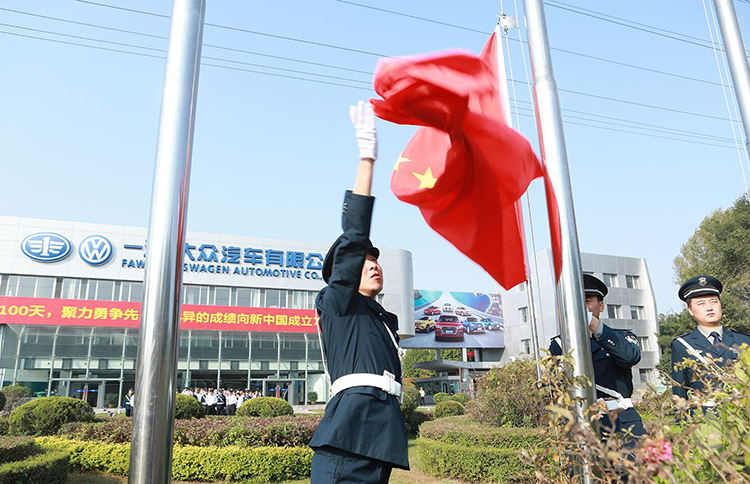 一汽-大众在206号门广场,举行庄严的升国旗仪式,公司党委委员、总经理刘亦功,在长部分高级经理,以及假期仍然坚守岗位的部分员工代表参加了升旗仪式。鲜艳的五星红旗在嘹亮的国歌声中,冉冉升起,全体人员面向国旗,怀着澎湃激动的心情,向国旗行注目礼。最后,大家齐声祝愿伟大祖国繁荣昌盛。
