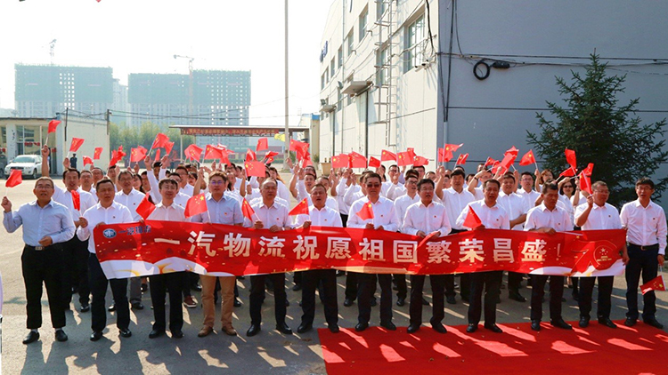 一汽物流公司隆重举行了升旗仪式,公司领导及广大职工代表出席仪式,共同表达对伟大祖国的无比热爱之情。升旗手和护旗手们踏着坚定的步伐走向旗台,伴随着雄壮的《义勇军进行曲》响起,鲜艳的五星红旗冉冉升起,一汽物流在场全体干部职工满怀热烈真挚的爱国情感高唱国歌,当国旗高高飘扬在一汽物流公司上空时,每一个在场的中华儿女都挥舞起手中的五星红旗,齐声高喊:“一汽物流祝愿祖国繁荣昌盛!”,为伟大祖国献上最深的祝福。