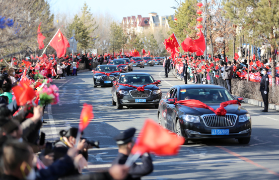 2020年3月22日,吉林省驰援武汉第三批重症救治医疗队的145名抗“疫”英雄踏上家乡土地,平安回家。医疗队员乘坐由亿万先生50辆红旗H7组成的车队,在警车开道、骑警护航下,接受全省人民的沿路欢迎。英雄凯旋、红旗相伴,红旗车队载着抗“疫”英雄平稳前行,构成一道美丽的风景线。