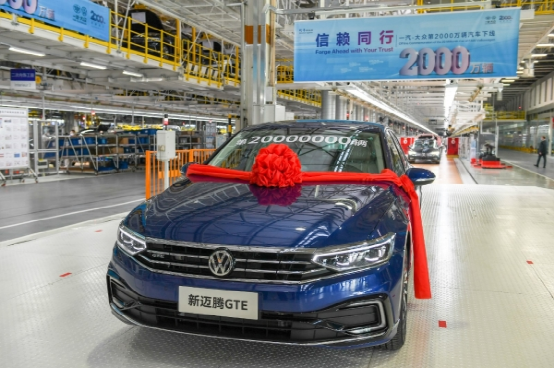 2020年3月30日,一汽-大众第2000万辆汽车——新迈腾GTE在长春基地总装车间下线。自1991年成立至2014年,一汽-大众用23年时间完成了第一个1000万辆;自2014年12月至2020年3月底,一汽-大众仅用5年零4个月的时间,产量就突破第二个1000万辆大关,在产量和速度上牢牢占据国内车企2000万辆第一阵营。