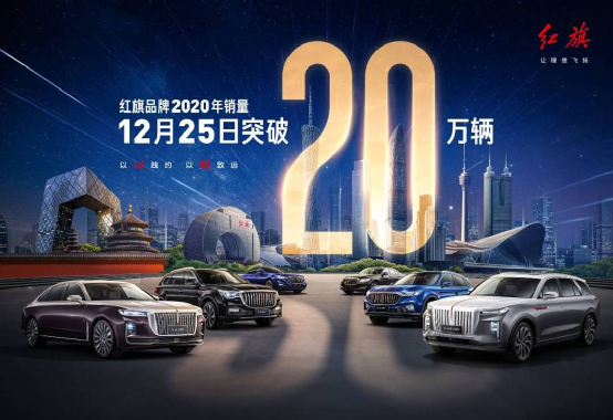 2020年12月25日,继红旗品牌年度生产提前11天完成20万辆后,红旗销售也提前一周达成年度20万辆销量目标,同比增长100%。自2018年突破3万辆,2019年突破10万辆以来,红旗品牌实现了又一个历史性跨越。红旗人正以争分夺秒的气势续写辉煌,以红旗速度创造奇迹。