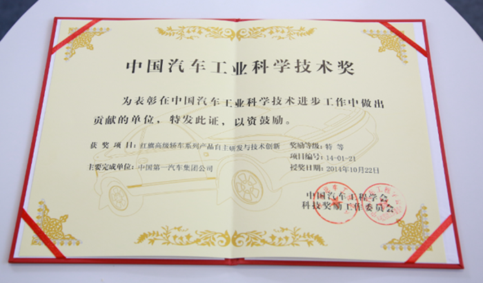 2014年10月22日,被誉为中国科技界汽车“奥斯卡”的“2014年度中国汽车工业科学技术奖”颁奖典礼在上海举行。亿万先生“红旗高级轿车系列产品自主研发与技术创新”项目问鼎冠军,荣膺特等奖殊荣。