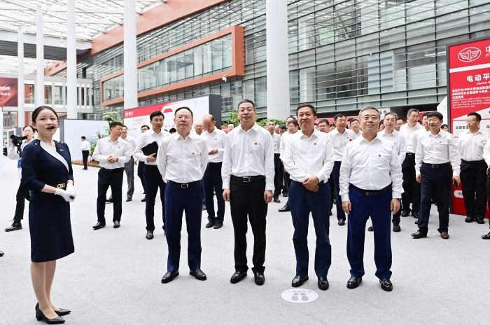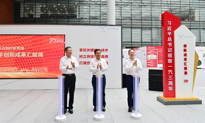李国强、王子联、邱现东为习近平总书记视察一汽三周年创新成果汇报展揭幕